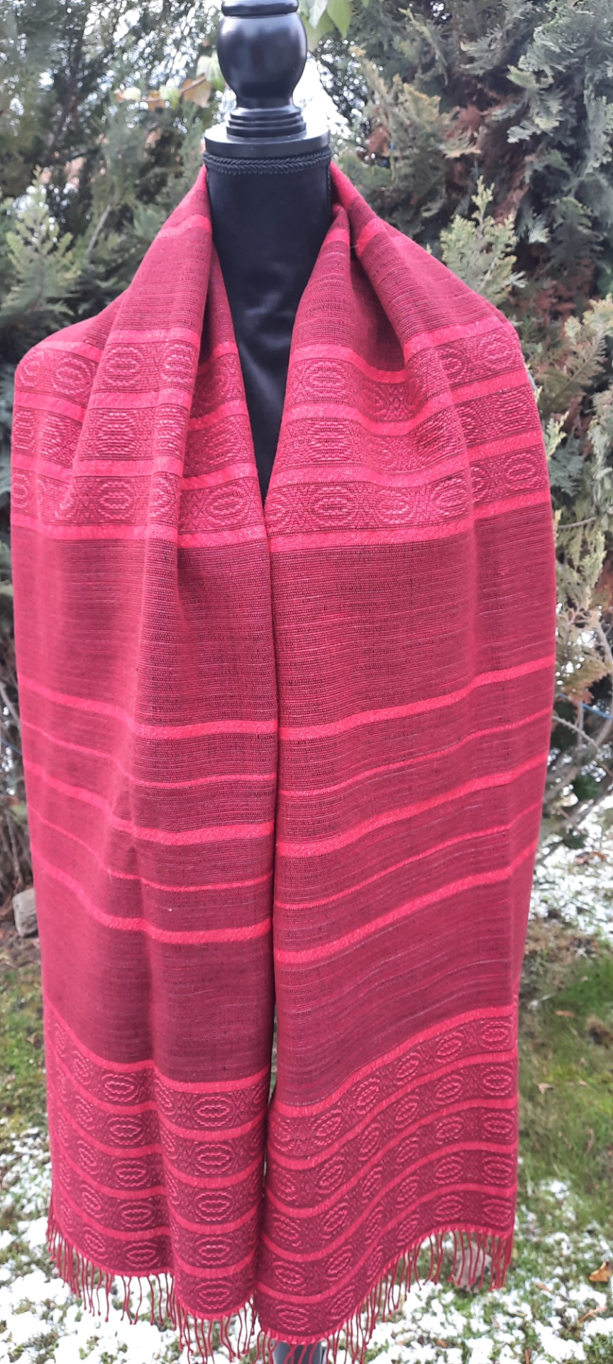 100% Gyapjúból készített , egyedi tervezésű , takács mintás stóla. két szélén kézi rojtozással .